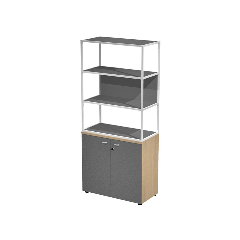 Libreria in metallo a 3 vani con struttura 20x20 mm a giorno con ripiani, base, cappello e un dietro in melaminico , sovrapposta ad un armadio basso, completo di ante battenti con serratura. Libreria metal completa di 1 dietro in melaminico posizionabile a scelta in fase di montaggio. Dimensioni: 90x46xH204cm