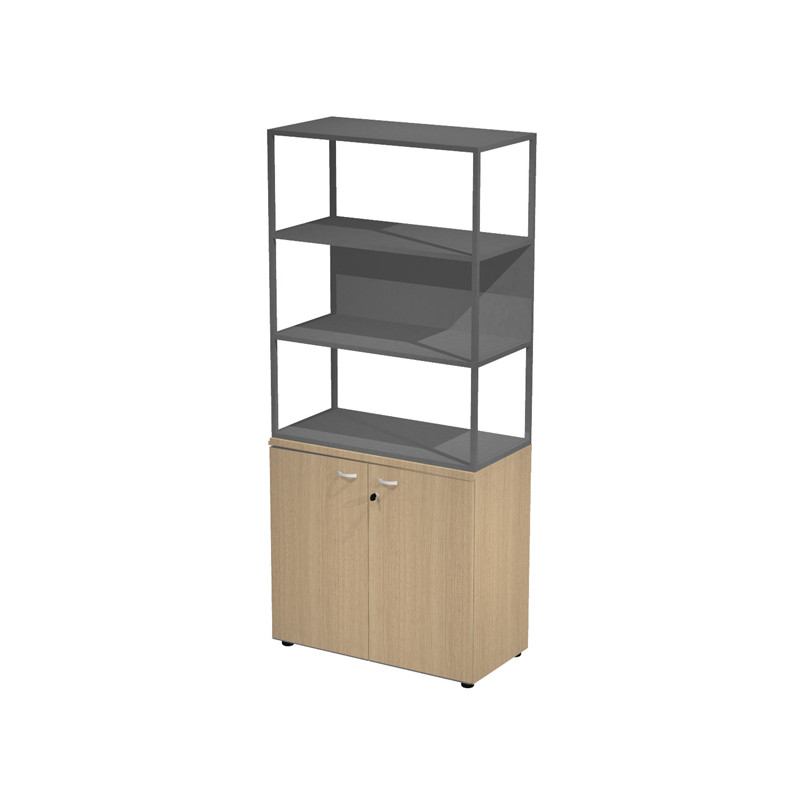 Libreria in metallo a 3 vani con struttura 20x20 mm a giorno con ripiani, base, cappello e un dietro in melaminico , sovrapposta ad un armadio basso, completo di ante battenti con serratura. Libreria metal completa di 1 dietro in melaminico posizionabile a scelta in fase di montaggio. Dimensioni: 90x46xH204cm