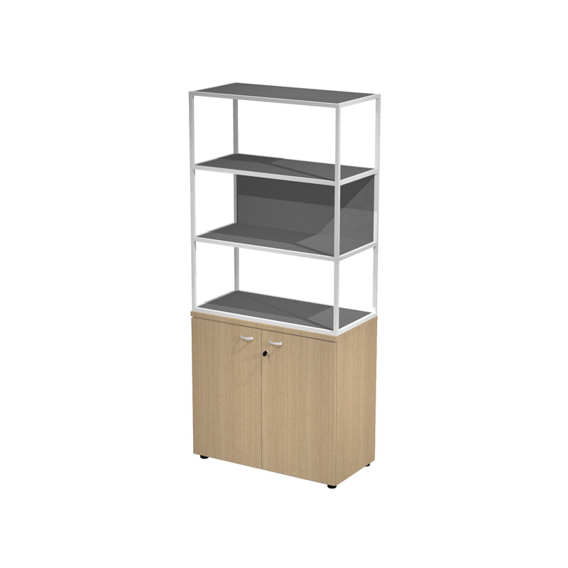 Libreria in metallo a 3 vani con struttura 20x20 mm a giorno con ripiani, base, cappello e un dietro in melaminico , sovrapposta ad un armadio basso, completo di ante battenti con serratura. Libreria metal completa di 1 dietro in melaminico posizionabile a scelta in fase di montaggio. Dimensioni: 90x46xH204cm