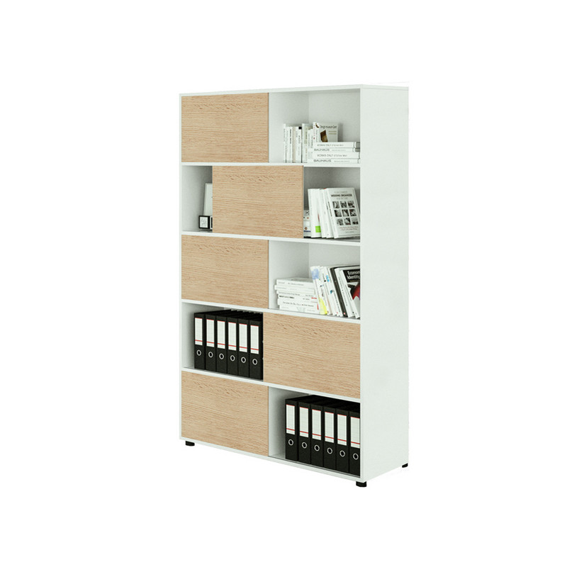 Libreria alta a 5 ripiani con 5 ante scorrevoli. Struttura e ante in truciolare nobilitato melaminico antigraffio ed antiriflesso spessore 18 mm. Piedini regolabili.