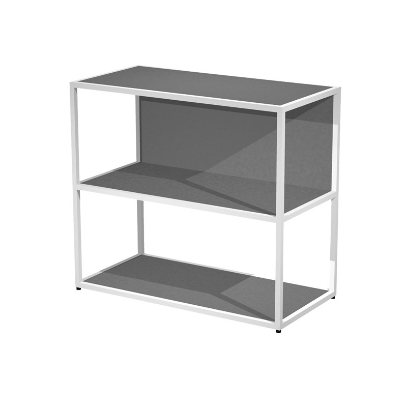 Librerie in metallo con struttura a sezione quadrata 20x20mm verniciate a polvere epossidica. Ripiani, base dietro e top in melaminico (il dietro può essere posizionato a scelta in qualsiasi vano). Le librerie possono essere installate a terra (kit di montaggio compreso con piedini regolabili in altezza) oppure possono essere allestite in sovrapposizione agli armadi). Libreria in metallo a 2 vani con struttura 20x20 mm, a giorno con ripiani, base, cappello e un dietro in melaminico (la schiena in melaminico è riposizionabile a scelta in fase di montaggio) - piedini regolabili in altezza. Dimensioni: 90x44xH80cm.