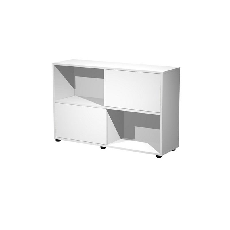 Libreria bassa a 2 ripiani con 2 ante scorrevoli. Struttura e ante in truciolare nobilitato melaminico antigraffio ed antiriflesso spessore 18 mm. Piedini regolabili.