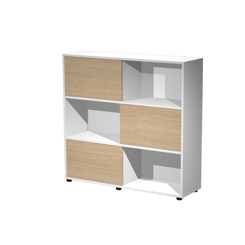 Libreria bassa a 3 ripiani con 3 ante scorrevoli. Struttura e ante in truciolare nobilitato melaminico antigraffio ed antiriflesso spessore 18 mm. Piedini regolabili.