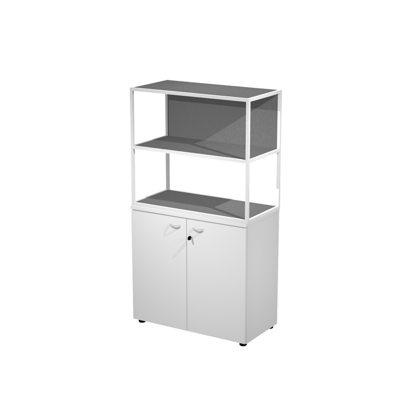 Libreria in metallo a 2 vani con struttura 20x20 mm a giorno con ripiani, base, cappello e un dietro in melaminico , sovrapposta ad un armadio basso, completo di ante battenti con serratura. Libreria metal completa di 1 dietro in melaminico posizionabile a scelta in fase di montaggio. Dimensioni: 90x46xH165cm