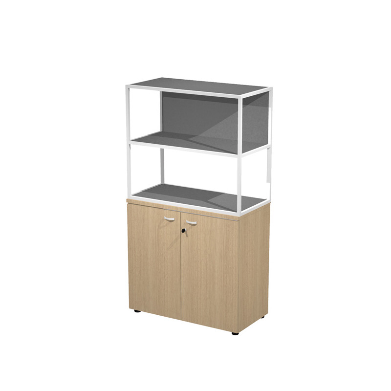 Libreria in metallo a 2 vani con struttura 20x20 mm a giorno con ripiani, base, cappello e un dietro in melaminico , sovrapposta ad un armadio basso, completo di ante battenti con serratura. Libreria metal completa di 1 dietro in melaminico posizionabile a scelta in fase di montaggio. Dimensioni: 90x46xH165cm