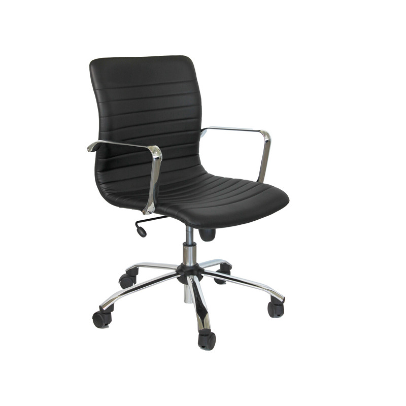 Poltrona direzionale girevole - sedile e schienale in multistrati di legno - elevazione a gas - meccanismo oscillante con blocchi - base e braccioli in acciaio cromato. Rivestimento seduta in tessuto "PLUS - Eco Leather" idrorepellente, facile da pulire, senza flatati e flame retardant. Braccioli inclusi (non rimovibili). Alt.tot.: 92-102cm; Prof.tot.: 70cm; Alt.schienale: 47cm; Larg.schienale: 50cm; Larg.seduta: 50cm; Prof.Sedile: 48cm; Altezza sedile: 44-54cm.