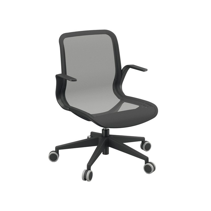 Poltrona direzionale girevole con elevazione a gas - meccanismo oscillante - base nylon. Rivestimento seduta in rete nera. Braccioli inclusi (non rimovibili). Alt.tot.: 88-111cm; Prof.tot.: 66cm; Alt.schienale: 51cm; Larg.schienale: 46cm; Larg.seduta: 49cm; Prof.Sedile: 46cm; Altezza sedile: 44 - 55cm.
