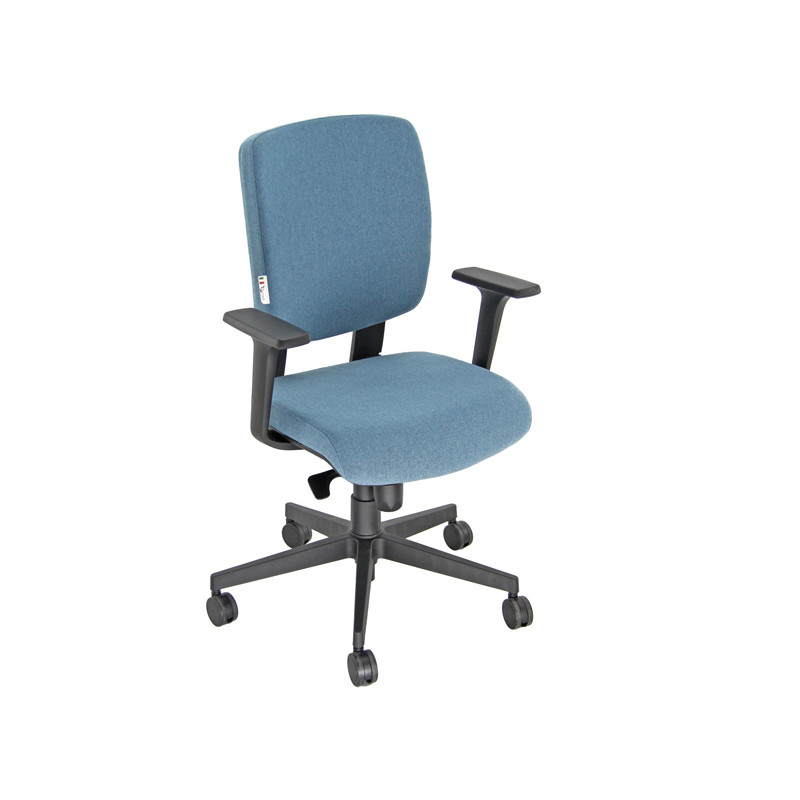 a contatto permanente - schienale regolabile up-down - supporto lombare regolabile; Rivestimento seduta in tessuto "SUPER - King L" 100% TREVIRA reazione al fuoco classe 1. Completa di braccioli regolabili. Alt.tot.: 101-111cm; Prof.tot.: 70cm; Alt.schienale: 53cm; Larg.schienale: 45cm; Larg.seduta: 50cm; Prof.Sedile: 46cm; Altezza sedile: 43 - 54cm.