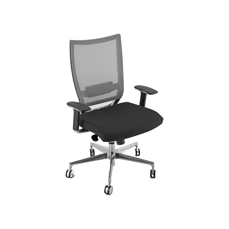 Poltrona indicata per utilizzo intenso (H24) e per pesi fino a 150kg. Schienale alto in rete grigia con supporto lombare regolabile. Rivestimento seduta in acrilico ignifugo. Braccioli in pressofusione, base e struttura in alluminio/acciaio; ruote in acciaio gommate. Meccanismo syncro. Meccanismo anti shock, meccanismo a contatto permanente. Elevazione a gas. Indicata per utilizzo intenso e per pesi fino a 150 kg
