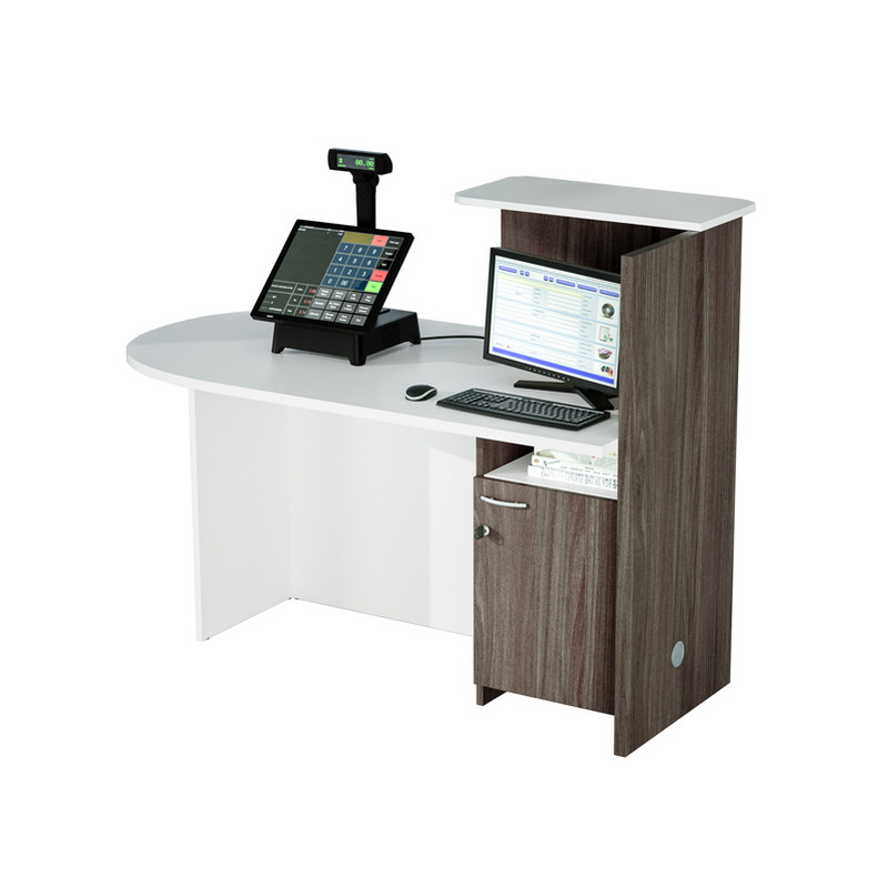 Reception ideale come postazione cassa in negozi, centri estetici ecc. o come reception in ambulatori, cliniche e ovunque sia necessaria una postazione di ricevimento confortevole ma compatta. Dotata di bancone con piano sagomato a SINISTRA 140x83xH73,3cm (sp. 25 mm). Mensola superiore 64x30cm sp. 18mm (H42cm dal piano). Due ripiani L38,2cm sotto il desktop. Fianco (sp. 25mm) con foro passacavi in corrispondenza del ripiano inferiore. Bicolore bianco/frassino toscano.
